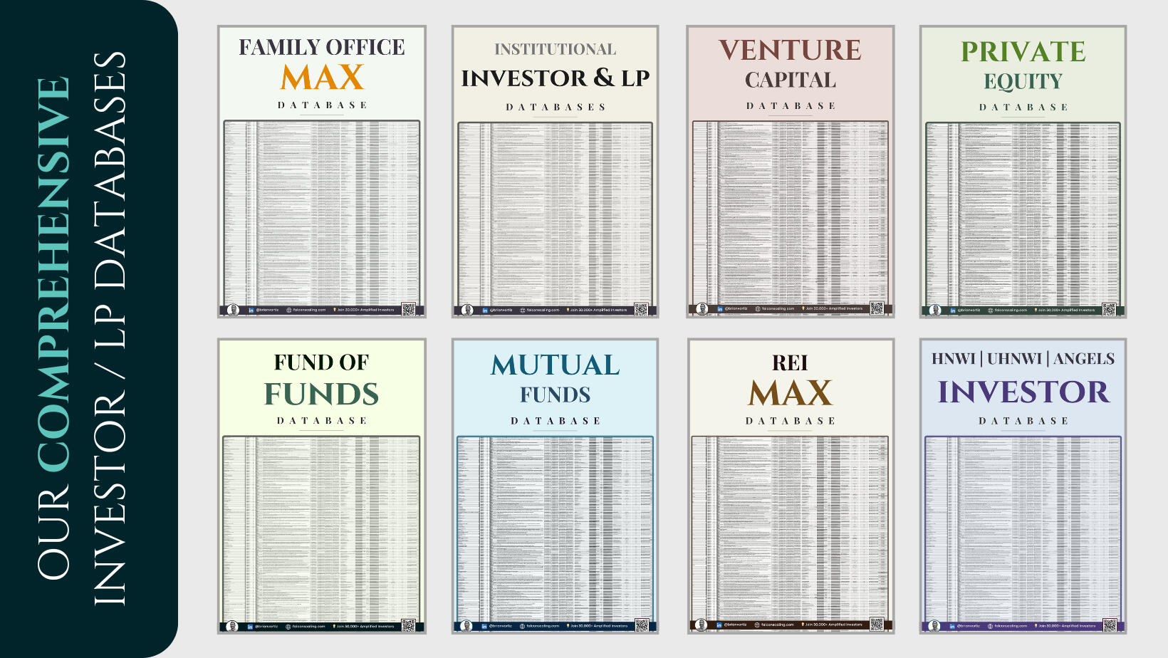 • Venture Capital Database - 100,000+ contacts with coverage across early to late-stage investors.• Angel & HNWI Investor Database - 13,000+ angel investors and high-net-worth individuals• Private Equity Database - 8,000+ PE professionals from 3,000+ firms with global coverage• CRM-Ready Email Database - 216,355+ contacts with validated emails formatted for instant CRM import• Real Estate Investor Database - 7,000+ contacts from 4,000+ entities with 6,000+ validated emails• Institutional Investor Database - 7,000+ decision-maker contact records with expanded location data coverage• Single Family Office Database - 3,300+ SFO contacts from 2,000+ unique single family offices• Fund of Funds Database - 1,000+ decision-makers with 50% U.S./50% International coverage• Asian Family Office Database - 3,000+ verified contacts from 1,500+ unique family offices• European Family Office Database - 3,300+ verified contacts from 2,000+ unique family offices• Investment Banking Database - 2,900+ contacts from 1,000+ unique banks with $500B+ Total AUM• Mutual Fund Database - 2,000+ verified contacts with 1,800+ professional emails• Startup Founder Database - 140,000+ verified contacts from recently funded startups with 140,000+ emails• Family Office Master Database - 16,000+ SFO/MFO/Connector contacts with enhanced multi-criteria search filters.• Legacy Database - Extensive library of 300+ legacy Excel files housing 150,000+ investor contacts• 2025's The Ultimate Capital Raising Blueprint (Including Family Office Capital Raise Blueprint 3.0)• 2025's Deal Flow Velocity Suite