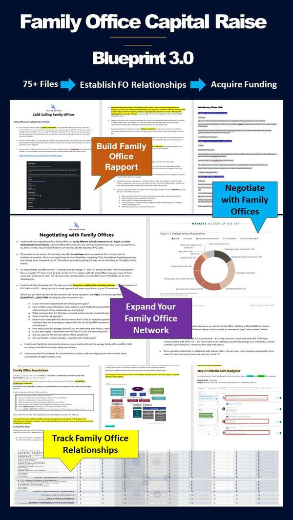 -> Venture Capitalists• Raise Capital 3-5X Faster• Reverse Negotiating Polarity & Secure Optimal Deal Terms• Identify Your Ideal Investors that are worth Forging Long-Term Relationships with• Create Viral Buzz & Authentic Demand: Let Investors Come to You• Leverage BATNA and Social Positioning to Maximize Your Investment Options• Position Yourself Best to Receive Multiple Term Sheets• Attract Those Investors That Most Closely Align with Your Vision & Values• Get All Your Collateral "Ducks" in a Row (Data Room, Investing Agreements, Valuation, Projections)• Learn to Acquire Funding from Angels, VCs, & Family Offices• Utilize a Hybrid Inbound (Attraction) / Outbound (E-Mail, Phone, & DM) Capital Raise ApproachThe Ultimate Capital Raising Blueprint (TUCRB) Contents:<Raise Capital From Family Offices Guide>Successfully raising capital through Family Offices is undoubtedly challenging.To fulfill funding goals, one must operate through the collaborative lens of congruence, reciprocity, and alignment.Family Office executives are experienced. They can sniff out inconsistencies.Having a systematized and strategic fundraising gameplan is essential in creating uniform positioning and fostering trust.Here's what's included in the FO Capital Raise portion of the TUCRB:• Intel from over 115+ Capital Raisers whose sole focus is on fundraising from Family Offices• Learn how to rapidly expand your network of Family Office Contacts on Linkedin• Learn how maximize the value of Warm Introductions (even without a large network)• The most successful Family Office Cold E-Mail Tactics & Strategies• The most successful Family Office Linkedin Connection & DM messaging• The most successful Family Office Twitter Connection & DM messaging• How to navigate and master the Family Office Negotiation Ecosystem• How to optimize your chances of getting funded using our Family Office Investor Database• How to successfully Cold-Call Family Offices with no pre-existing relationship• Family Office Cold-Call Scripts• Family Office Pre-Call Checklists• Learn How Congruent Positioning can be used to Secure a Family Office Investor...and much more...<Secure Funding Through Venture Capital>• Learn how to maximize every ounce of your leverage when negotiating with VCs• Weigh the full gamut of deal "terms" intelligently; beyond just valuation and dilution considerations• Learn how VCs are going to likely value your company in the 1st Quarter of 2024• Learn the (3) factors that you absolutely must have in order to maximize your negotiating position• Learn how to self-assess and rank different silos of Investability• Learn the critical metrics to calculate before speaking to any VC• Learn how to effectively cold-email and utilize Linkedin to connect with VCs• Learn how to use Twitter to attract an almost unlimited supply of VCs• 15+ sample VC cold-email templates• Learn how to maximize your current network's Investability potential...and much more...<Secure Funding Through Angel Investors & HNWIs>• Laser-target swaths of Angels & HNWIs that are Most Relevant for your funding goals• Identify the Angels & HNWIs that have the highest likelihood of responding to your pitch• Learn what terms and conditions you Should include in an Angel Term Sheet• Learn how to prepare a Realistic Valuation to present to Angels and HNWIs• 10+ Sample Angel cold email templates• Learn How to utilize Linkedin Sales Navigator to laser-target specific Angel subsets...and much more...<Data Room, Supporting Collateral, Investor Agreements, Calculators, & Financial Models>• Term Sheets